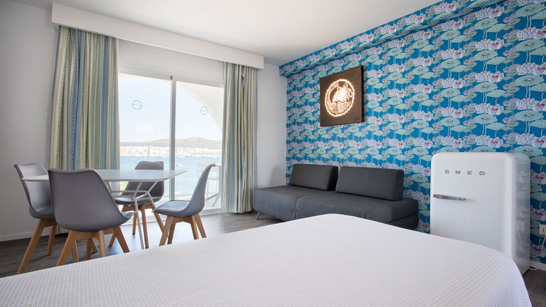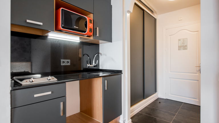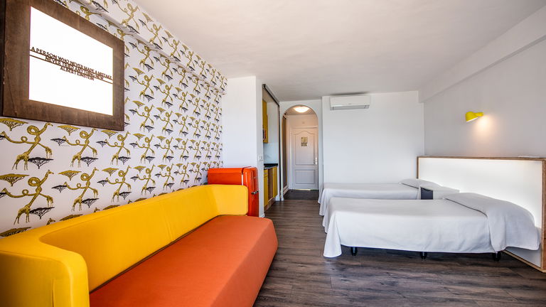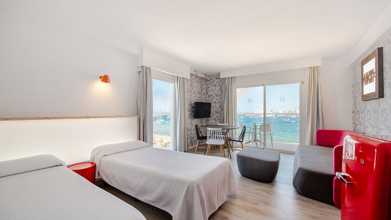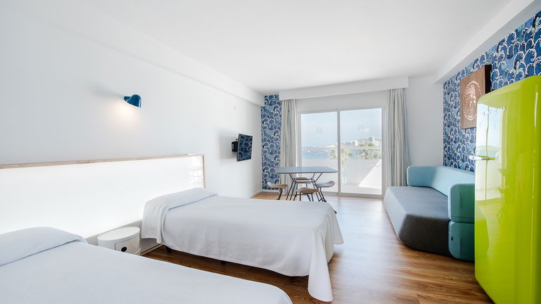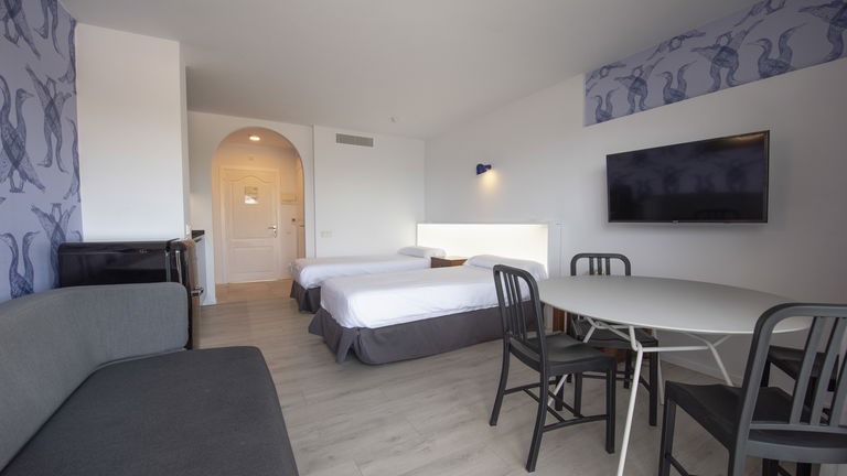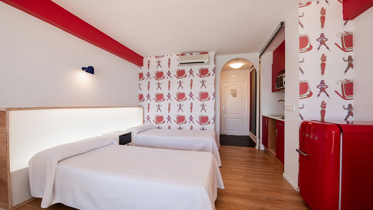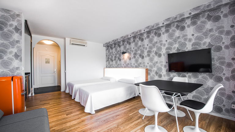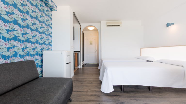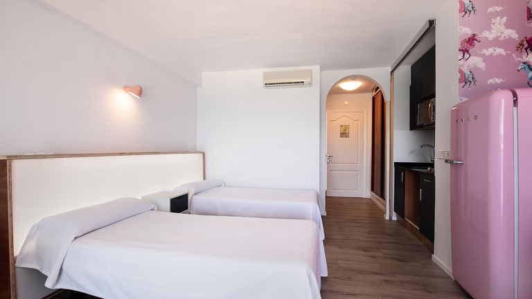 Estudio con 2 camas individuales, sofá cama, aire acondicionado, TV, balcón, zona de cocina completa con microondas y nevera y baño privado con bañera o ducha.