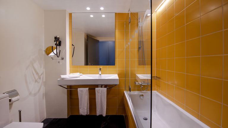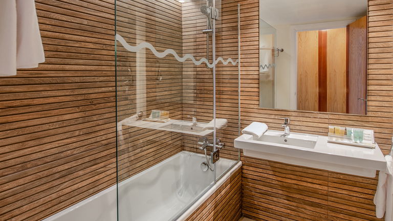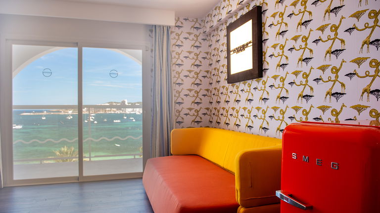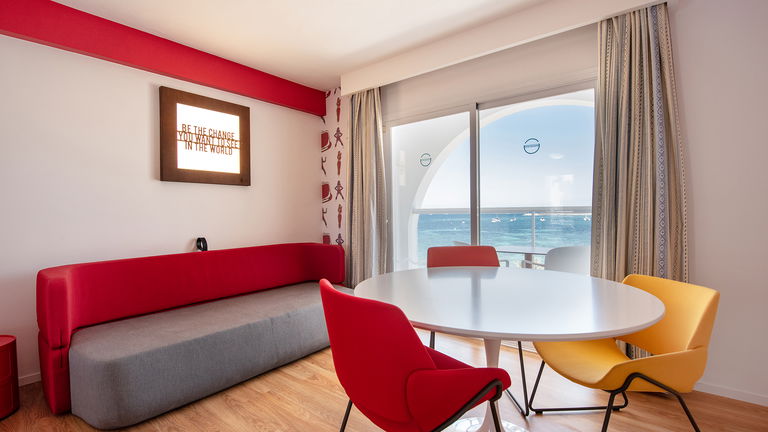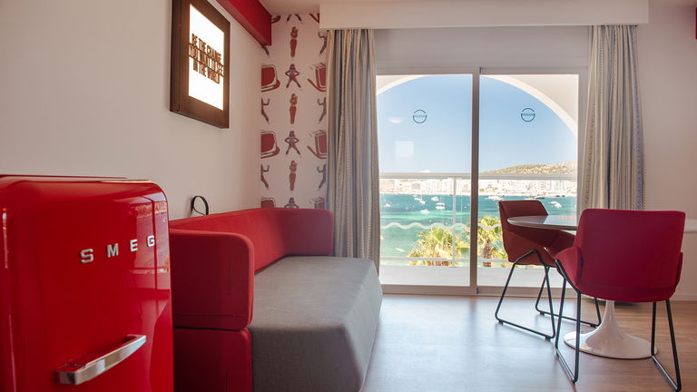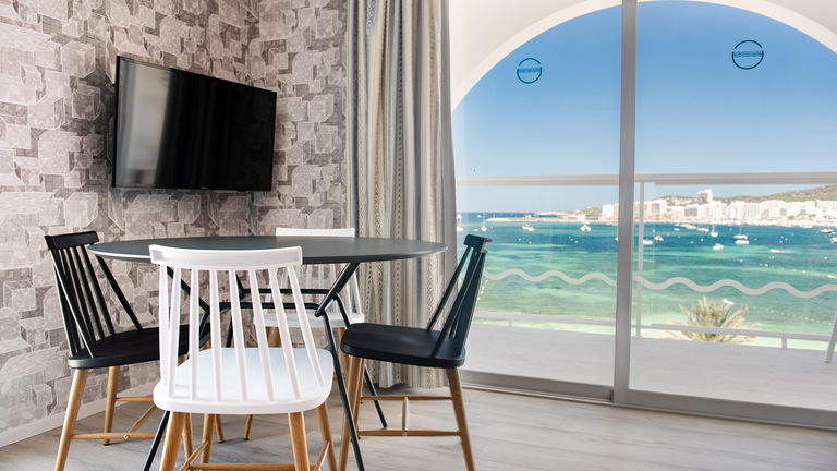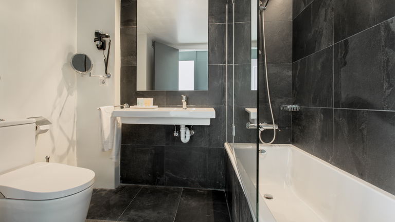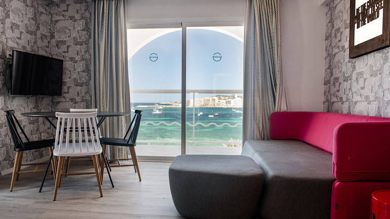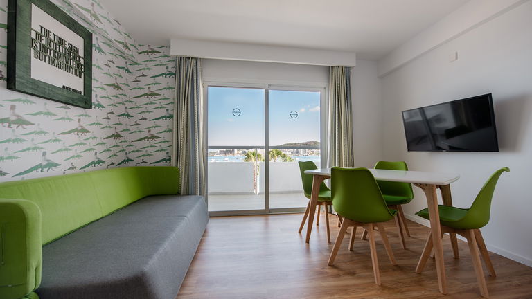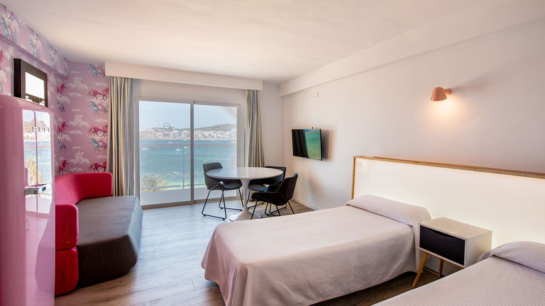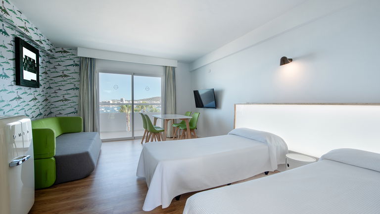 Estudio con 2 camas individuales, sofá cama, aire acondicionado, TV, balcón, zona de cocina completa con microondas y nevera y baño privado con bañera o ducha.