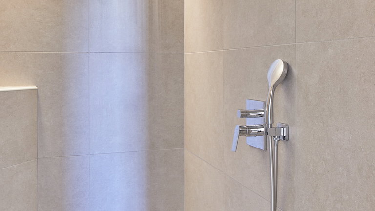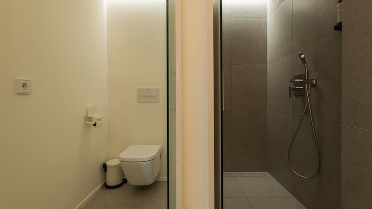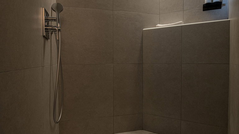 La ampliación de la junior suite nos ha permitido poner la ducha y el inodoro enestancias separadas, con terraza más amplia amueblada y con banco obra y piedra tan característico de la arquitectura ibicenca.