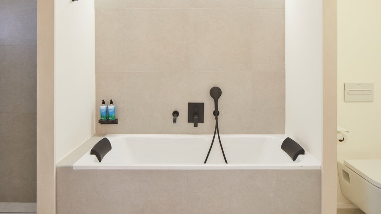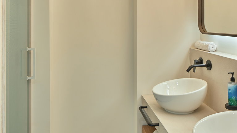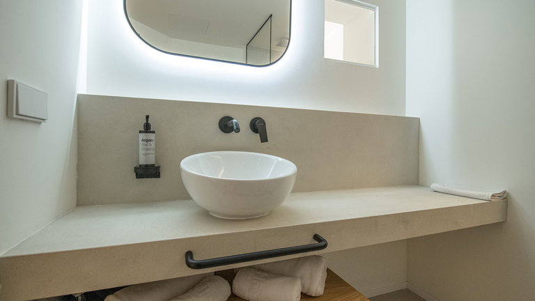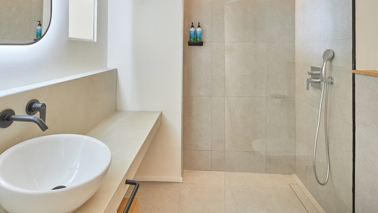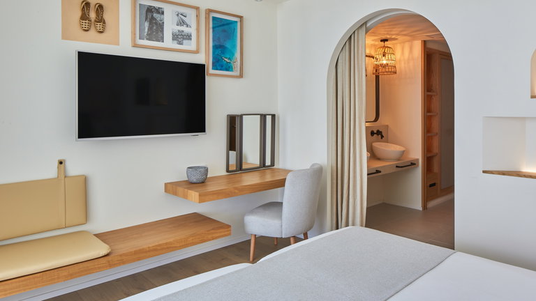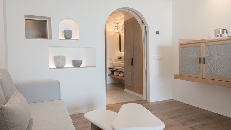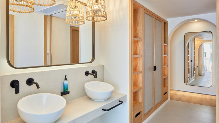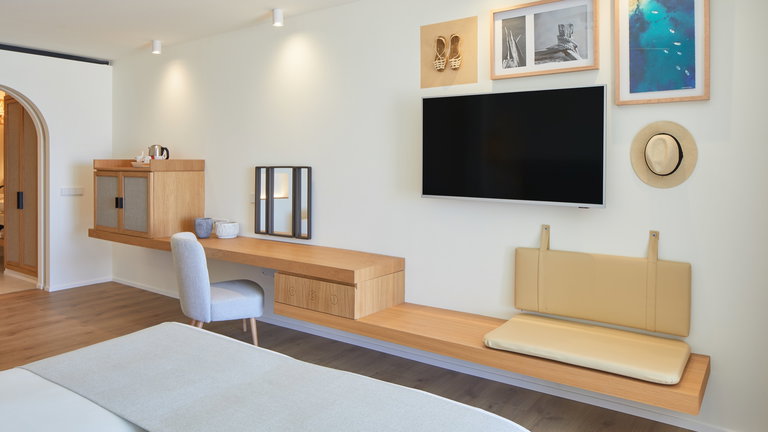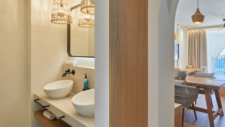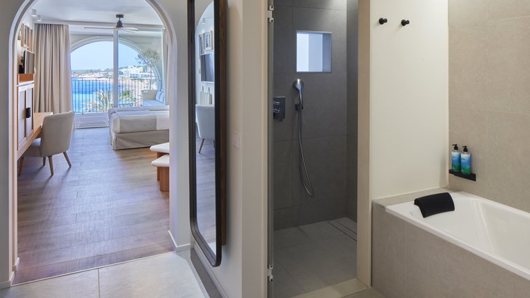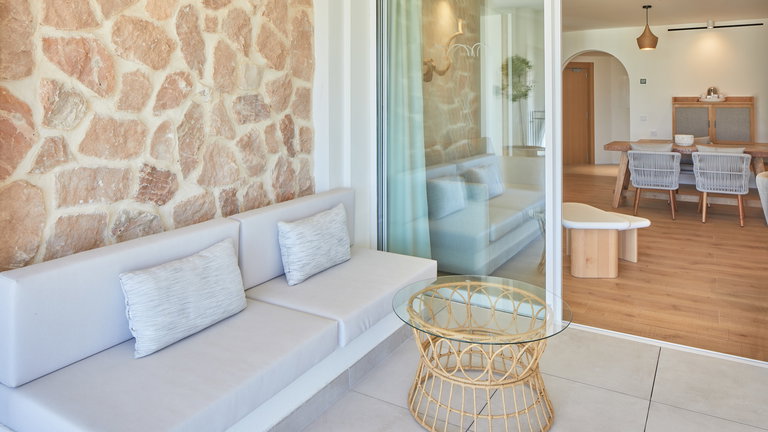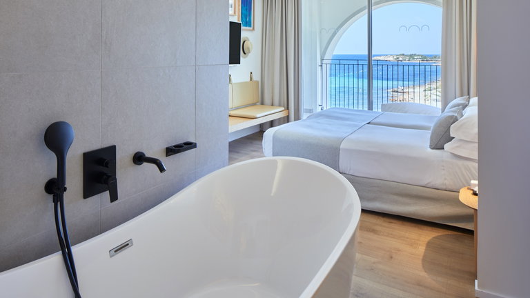 La ampliación de la junior suite nos ha permitido poner la ducha y el inodoro en estancias separadas, con terraza más amplia amueblada y con banco obra y piedra tan característico de la arquitectura ibicenca. Con todas las prestaciones de las junior suite vista mar, se caracterizan por ser más ampl