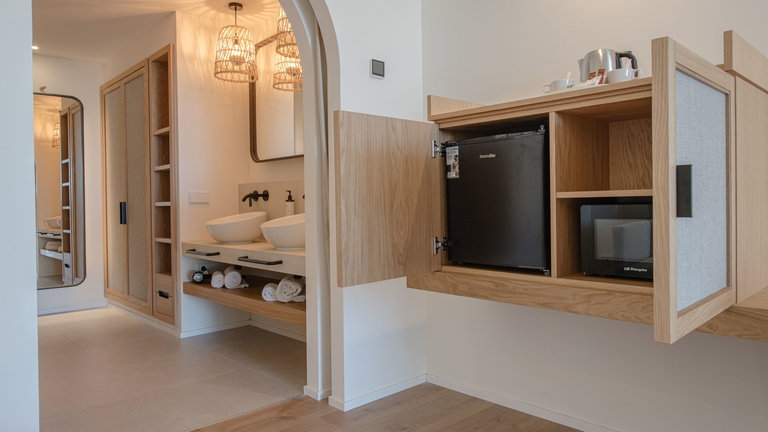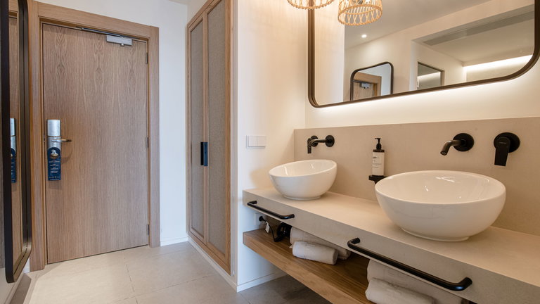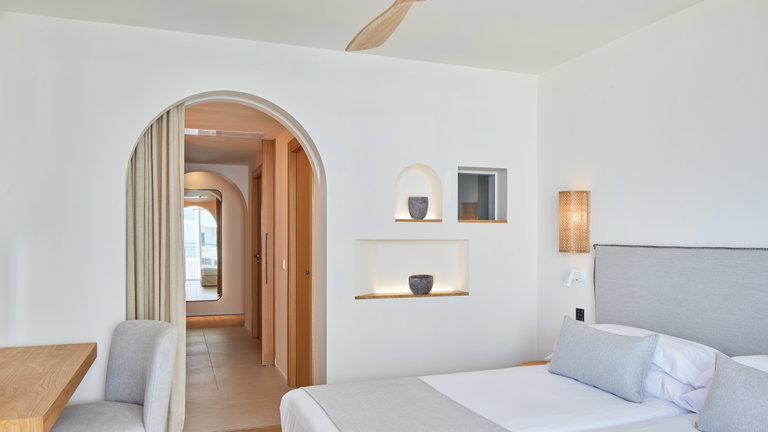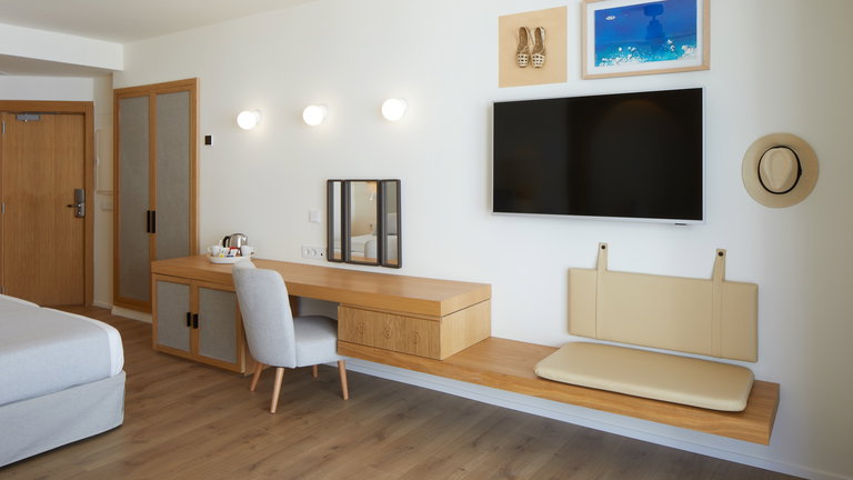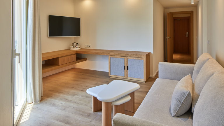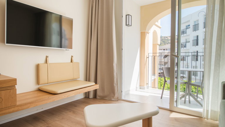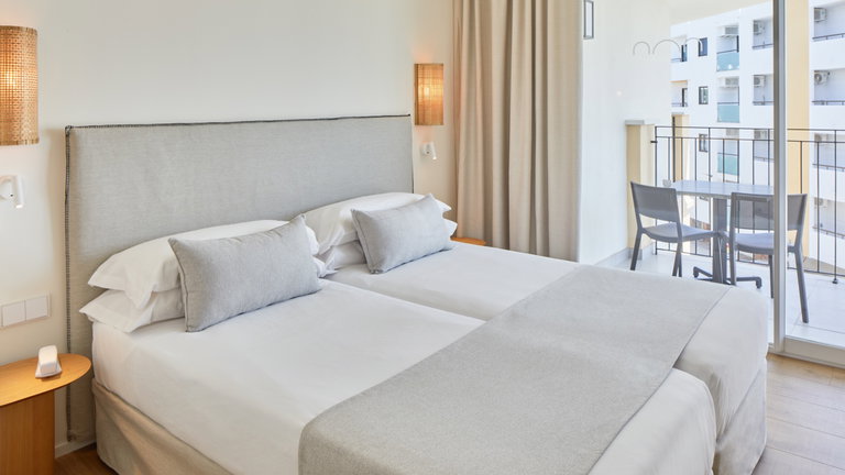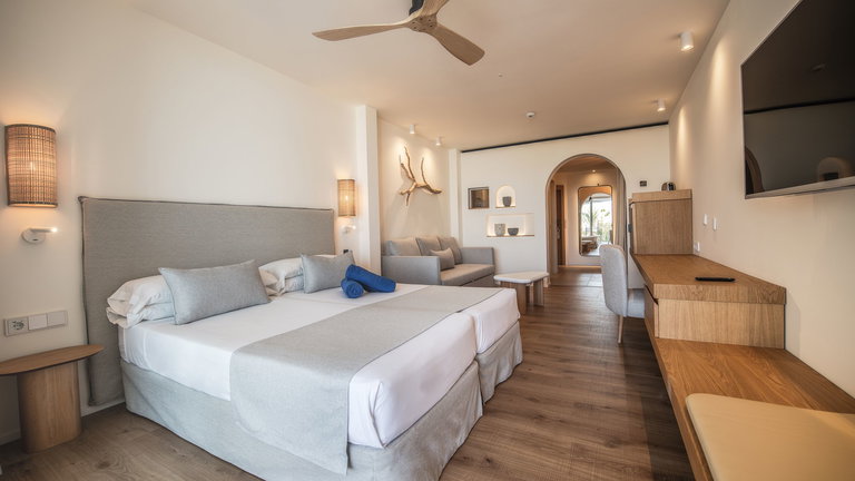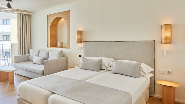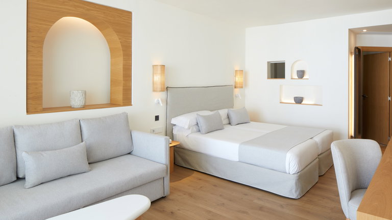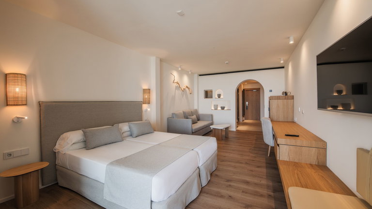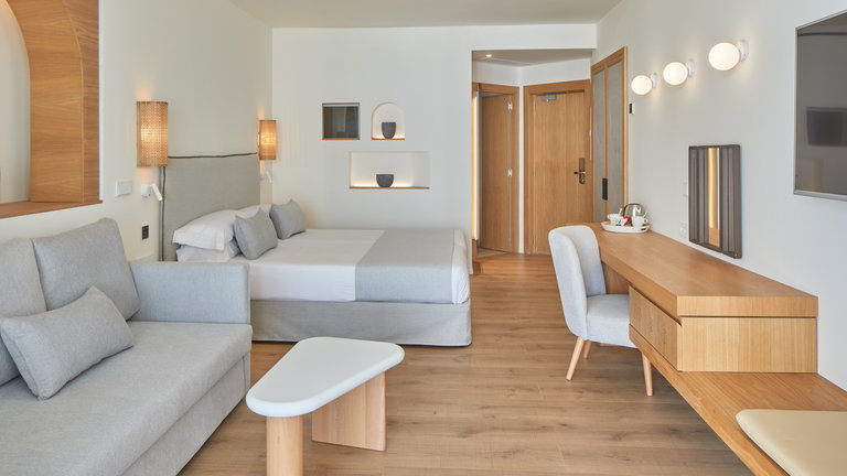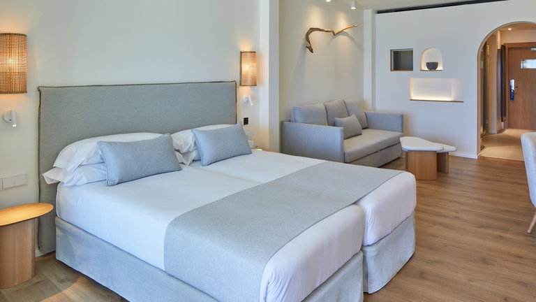 Son habitaciones completamente equipadas, de menor tamaño que las junior suite y baño en una misma estancia, aire acondicionado, ventilador, TV satélite, terraza, mini-nevera y microondas, con dos camas (con posibilidad de convertirla en cama de matrimonio) y sofá-cama perfectas para disfrutar de una estancia tranquila, en pareja o con la familia.