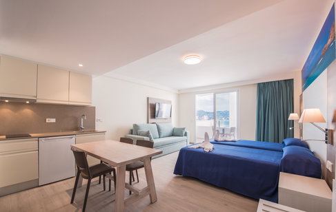 Estudios (zona de estar y dormitorio en la misma estancia), con vistas a la bahía, con cocina tipo kitchenette totalmente equipada, televisión, wifi gratuito, baño completo, caja fuerte gratuita, terraza amueblada y aire acondicionado.